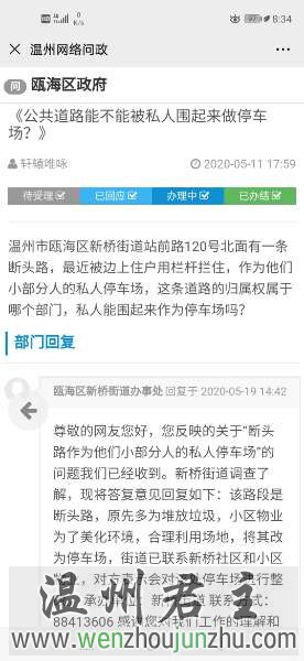 瓯海区新桥街道办事处答复: