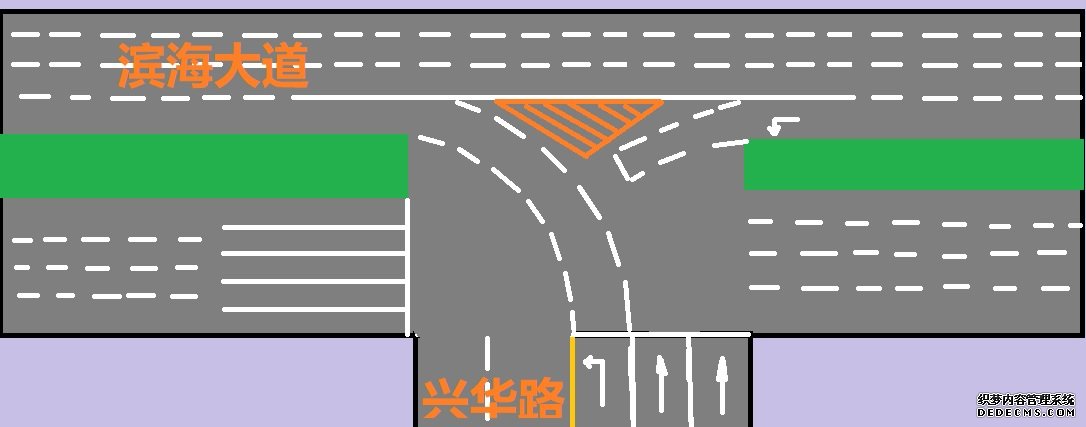 图中所示,滨海大道由南向北,直行车辆不受红灯限制,在临近兴华路附近,分出一个左转待行车道等待红绿灯,这样做的好处就是可以实现滨海大道南向北无红灯通行,大大增强通行能力,同时不妨碍左转车辆。